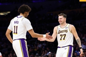 东契奇和海斯击掌庆祝!湖人晒赢球海报:今晚洛杉矶很吵
