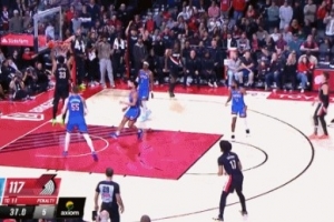一锤定音!卡马拉溜底线接球双手暴扣 开拓者领先5分打停雷霆