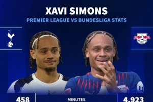 水土不服?西蒙斯德甲每90分钟参与0.69球,登陆英超7场联赛仅1助