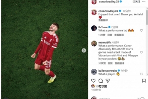 当选队内最佳!布拉德利社媒:享受这场比赛,谢谢安菲尔德