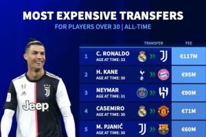 30岁以上球员转会费榜:C罗33岁1.17亿欧居首 凯恩内马尔分列二三